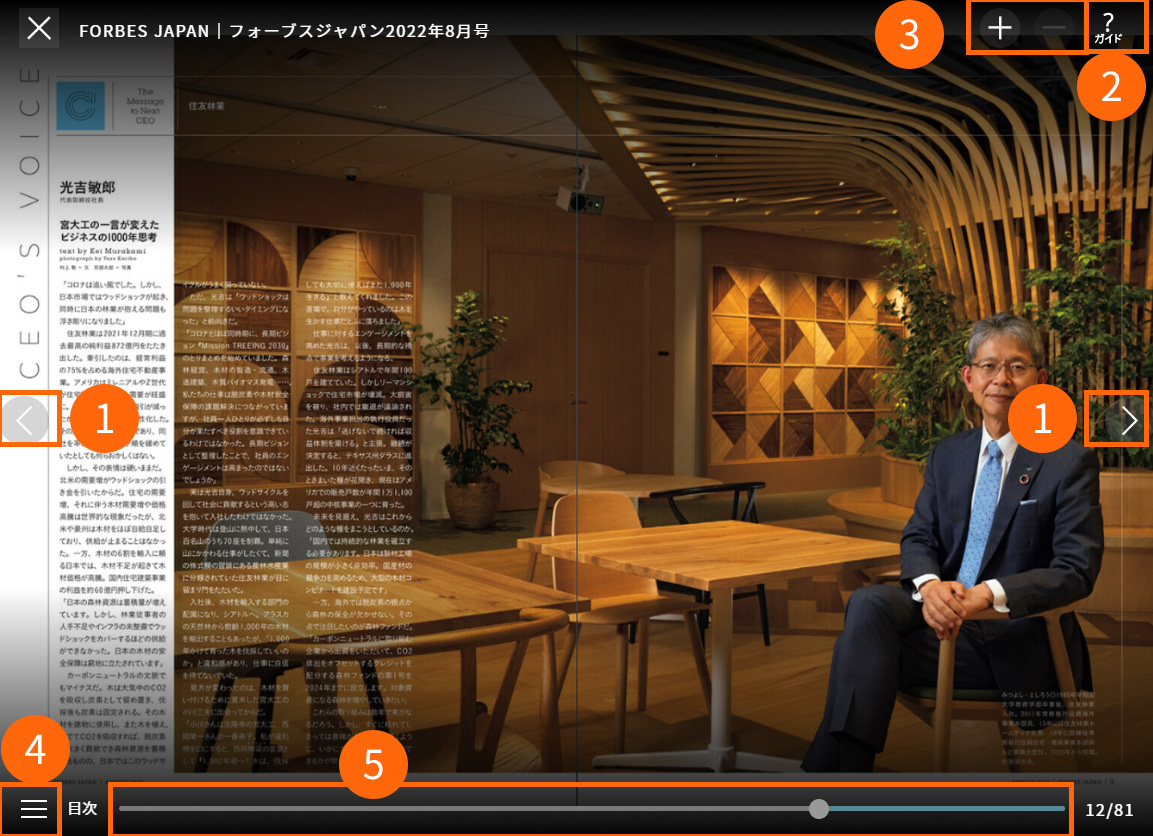 - ⑤スライダーを左右にドラッグ&ドロップするとそのページに移動することが出来ます。